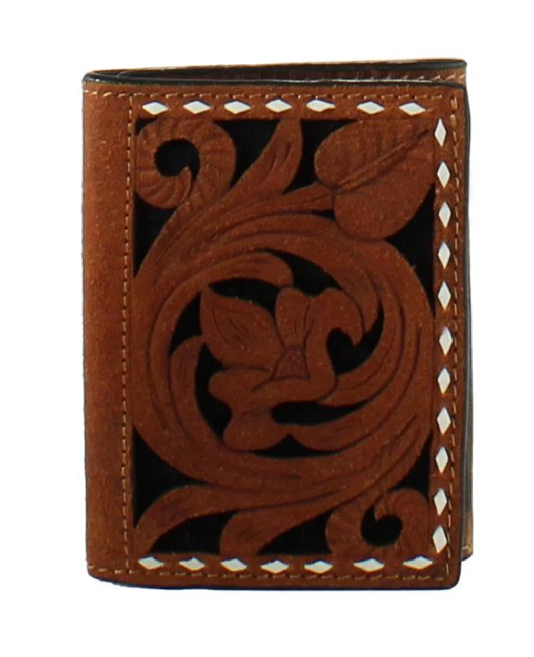 Decorative and stylish menâs 3D trifold wallet. Roughout floral filagree on top with a black inlay. The outer border is accented with a white buck lace stitching and the back of the wallet is dark brown. Multiple slots for cards and a clear ID pocket. 3D Trifold Wallet Brown with Floral Filagree Black Inlay 6 Card Slots Clear ID Pocket