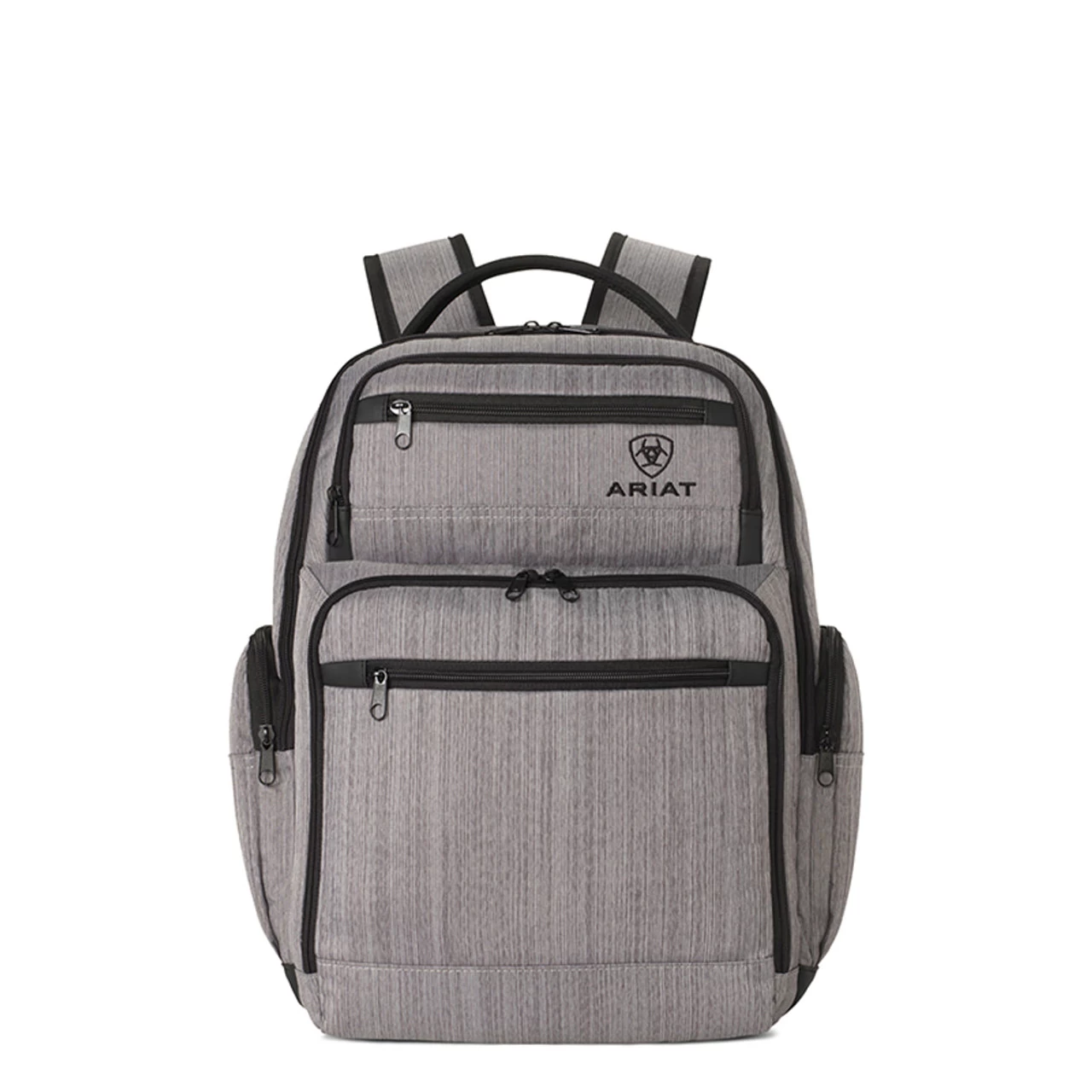 This durable Ariat backpack is a must have for anyone who has a lot to carry. Two part compartment backpack that offers a storage space for laptop in the back compartment. The front compartment has organizational storage as well as an empty space. Zipper compartments on both sides of the backpack for storage. The front has one large, one medium and 2 small zipper compartments for storage. The back has cushion for comfort. Straps are gray canvas and are adjustable. Ariat Backpack Grey Canvas Print Back is Black Ariat Signature Logo Grey Canvas Adjustable Straps