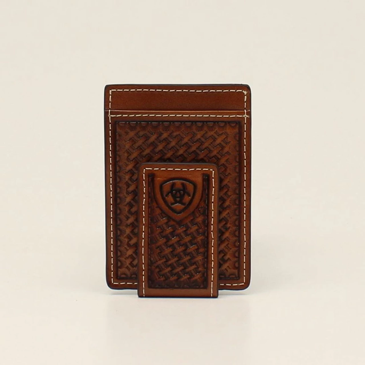 When you donât want to carry a big wallet, this Ariat money clip wallet by M&F Western Products is just what you need. Basketweave embossing with Ariat shield logo on the bottom corner.