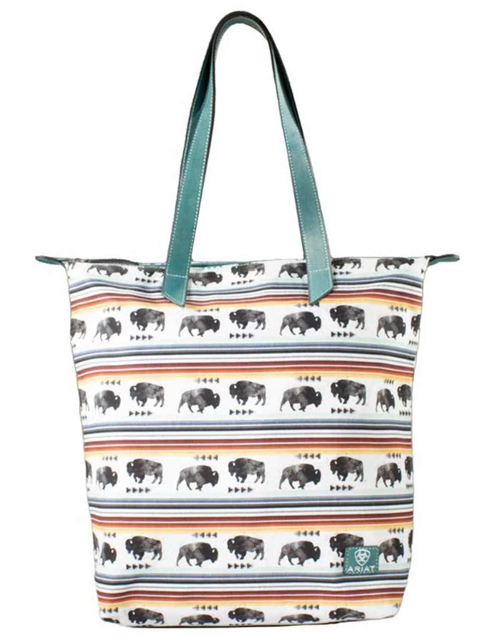Easy to carry Ariat cruiser tote by M&F Western Products. It is made of a buffalo and multi colored stripe canvas print. Turquoise leather trim and handles and a turquoise leather Ariat patch. Ariat Cruiser Tote Multi Colored Measures: 11-5/8 x 15-3/4 x 5-3/4 Buffalo and Multi Colored Stripes Turquoise Leather Trim and Handles 1 Inside Zip Pocket 1 Outside Zip Pocket Zip Closure 80% Cotton and 20% Leather