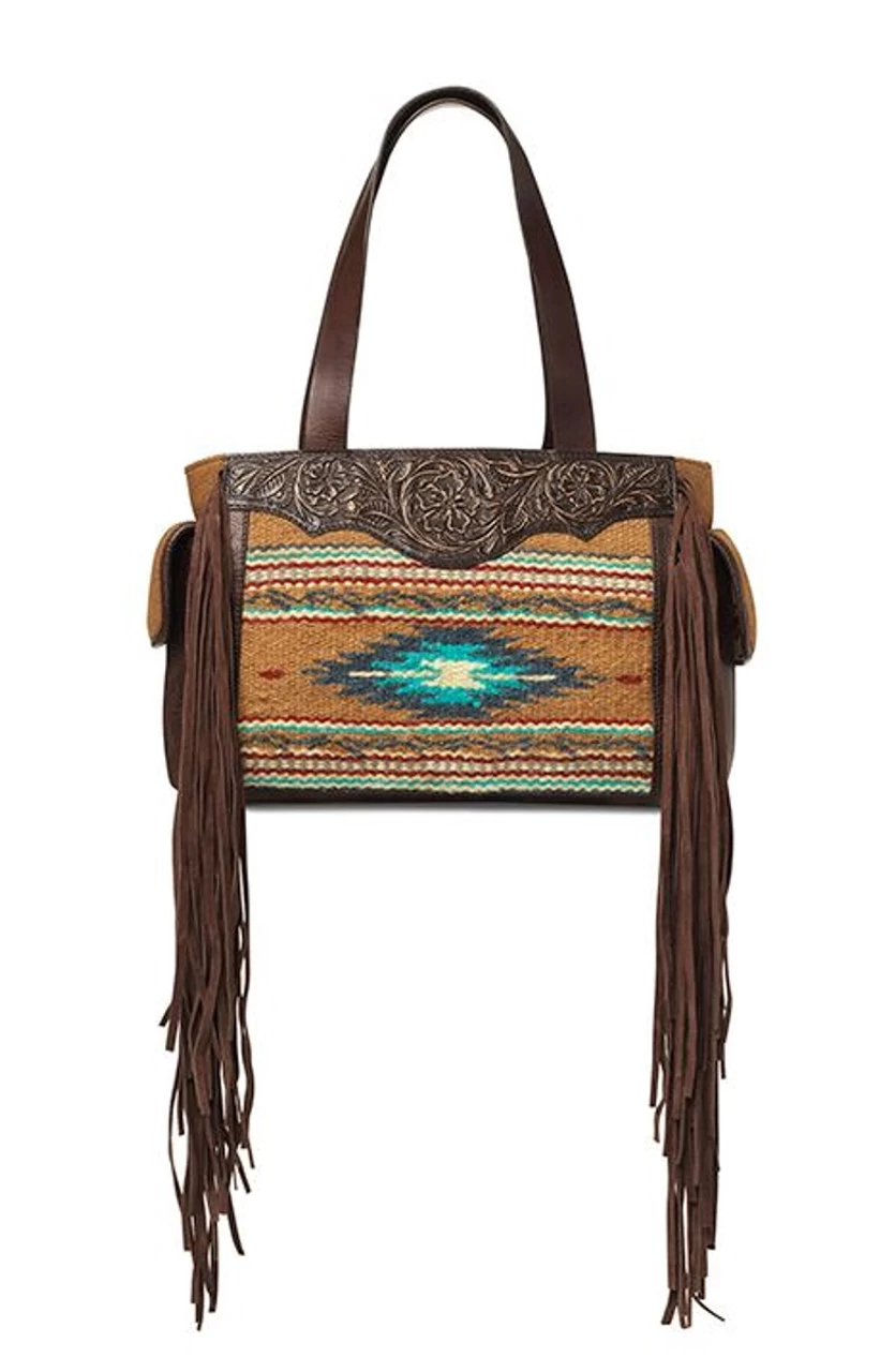 Ariat ladies conceal carry satchel from the Nellie collection. There are two outside pockets, one on either side with a button closure. The body of the bag is designed with a rug fabric in Aztec print with a floral tooled yoke. Fringe hangs on either side. Zipper closure to keep all of your belongings safe. Ariat Conceal Carry Satchel Brown Leather Body with Aztec Print Nellie Style Zipper Closure 30% Leather, 30% Suede, 15% Dari, 25% Canvas Measures: 8 x 13 x 4-1/2
