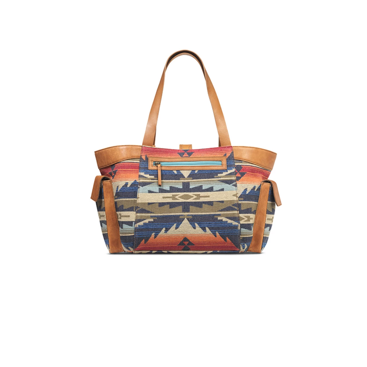 Ariat ladies conceal carry satchel from the Wynonna collection. Inside has 2 open pockets and one zipper pocket. Outside has 2 pockets. The body of the bag is covered in a colorful southwestern pattern. Top of the bag securely closes with a zipper and a leather strap that buttons. Ariat Conceal Carry Satchel Multi Colored Southwestern Pattern Wynonna Style Zipper Closure Pockets on Sides Adjustable Strap 40% Leather, 50% Jacquard, 10% Suede Measures: 11 x 11-1/2 x 5-1/2