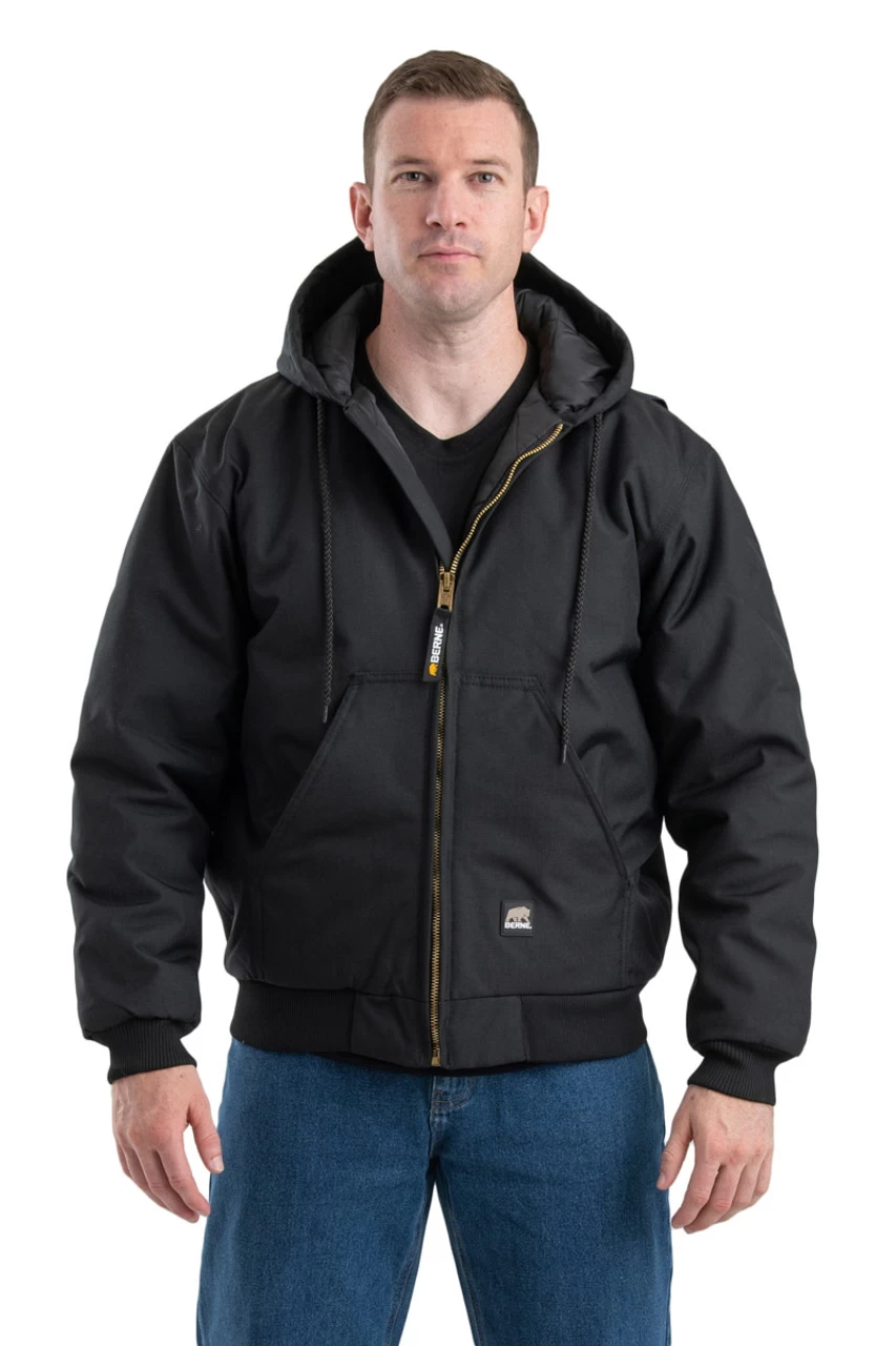 - Three-piece insulated hood with drawstring traps the heat