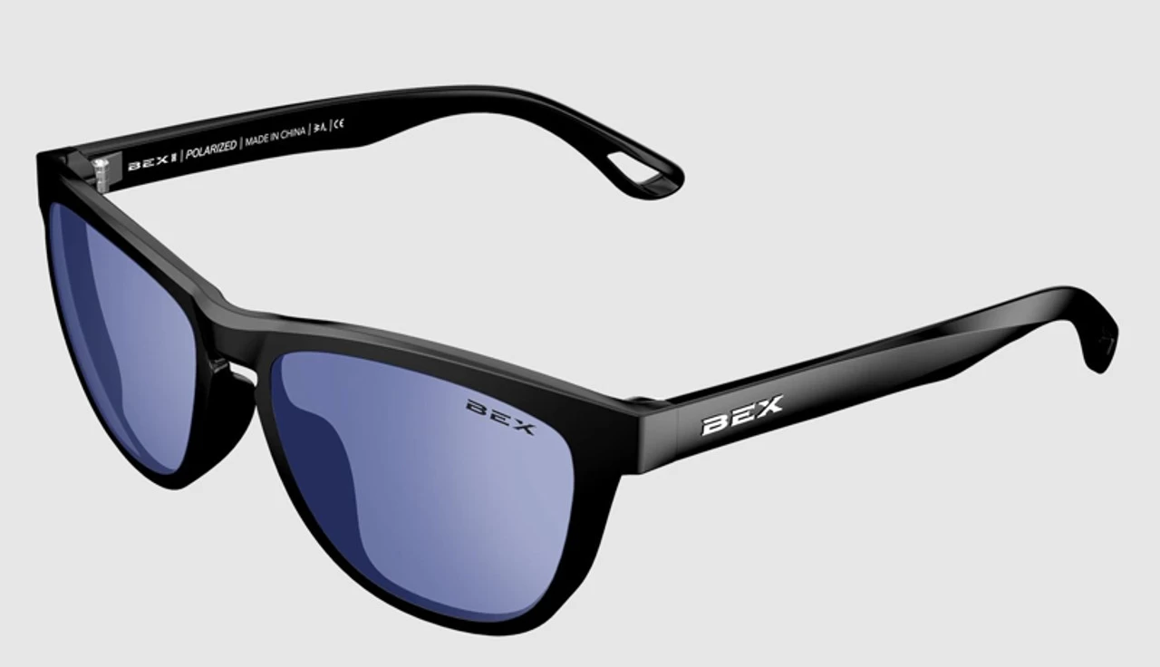 - Black/Lavender: Shiny black frame, with Live Gray tint, and a Lavender Echo coating. The temples have a raised and pad-printed BEX logo.