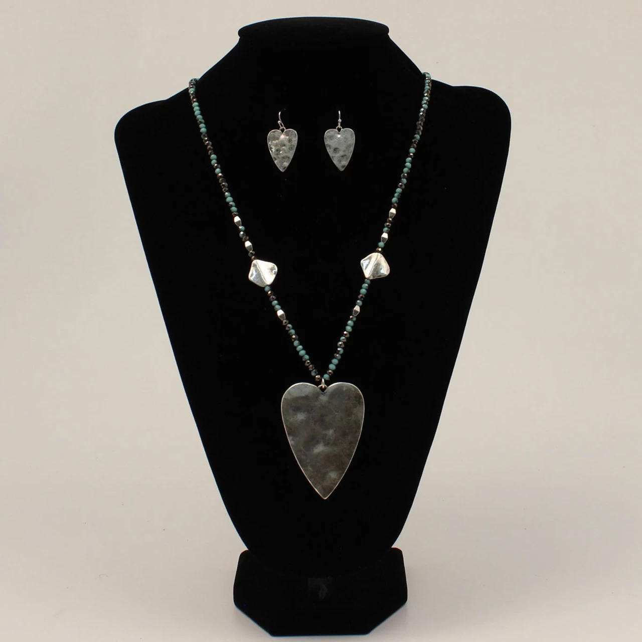 This beautiful Blazin Roxx set is by M&F Western Products. The strand has blue and grey shimmery beads with a hammered silver heart pendant. Matching heart drop earrings.