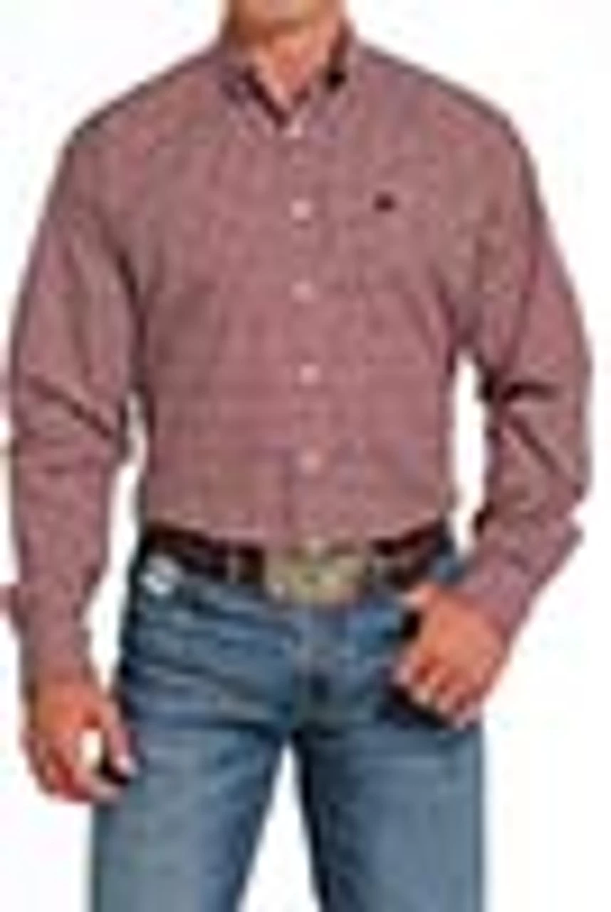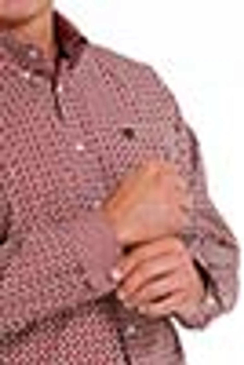 Cinch Men’s Red Multi Print Button Up Long Sleeve Western Shirt Red Multi Print Long Sleeve Button Down Shirt Adjustable Button Cuffs Left Front Pocket with Embroidered Cinch Logo White Buttons Spread Collar Contrast Trim