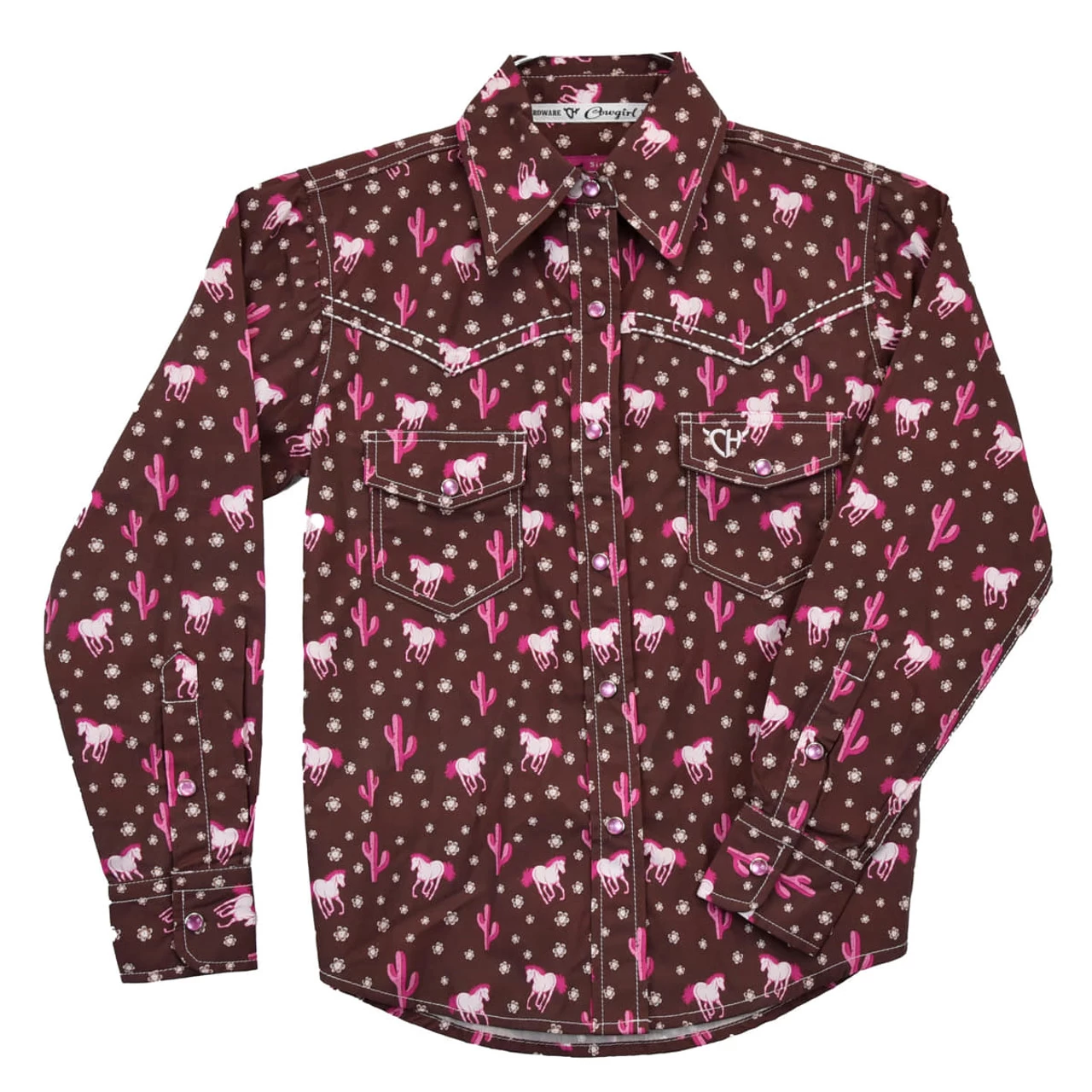 Cowgirl Hardware Girls Long Sleeve Brown Cactus/Horse Print Shirt