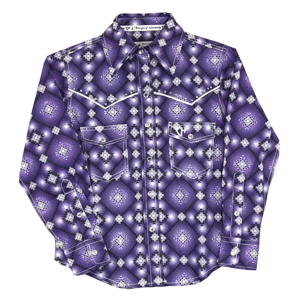 Cowgirl Hardware Girls Purple Diamond Aztec Print Long Sleeve Top Purple and White Diamond Aztec Print White Embroidery Western Yokes with Rhinestones across Front Two front chest pockets with snap flap closure and “CH” embroidery on left pocket Adjustable snap cuffs Snap down front placket Crystal snaps Spread Collar