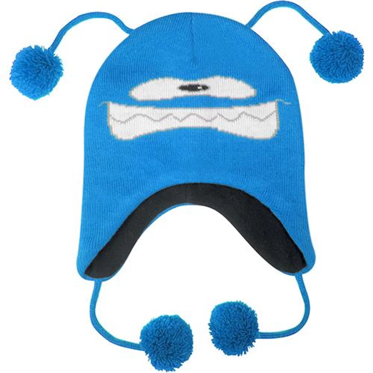 Acrylic knit flap cap with monster jacquard, fleece lining, shoestring ties, and single color poms.
