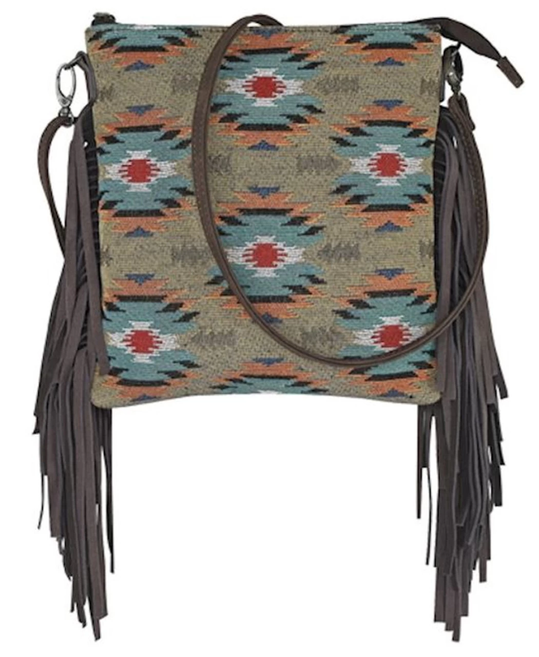 Justin Multicolor Ladies Jacquard with Genuine Leather Fringe North South Crossbody 1 Internal Zip Pocket Justin Concho on Back Adjustable Shoulder Strap 2 Slip Pockets Zip Closure