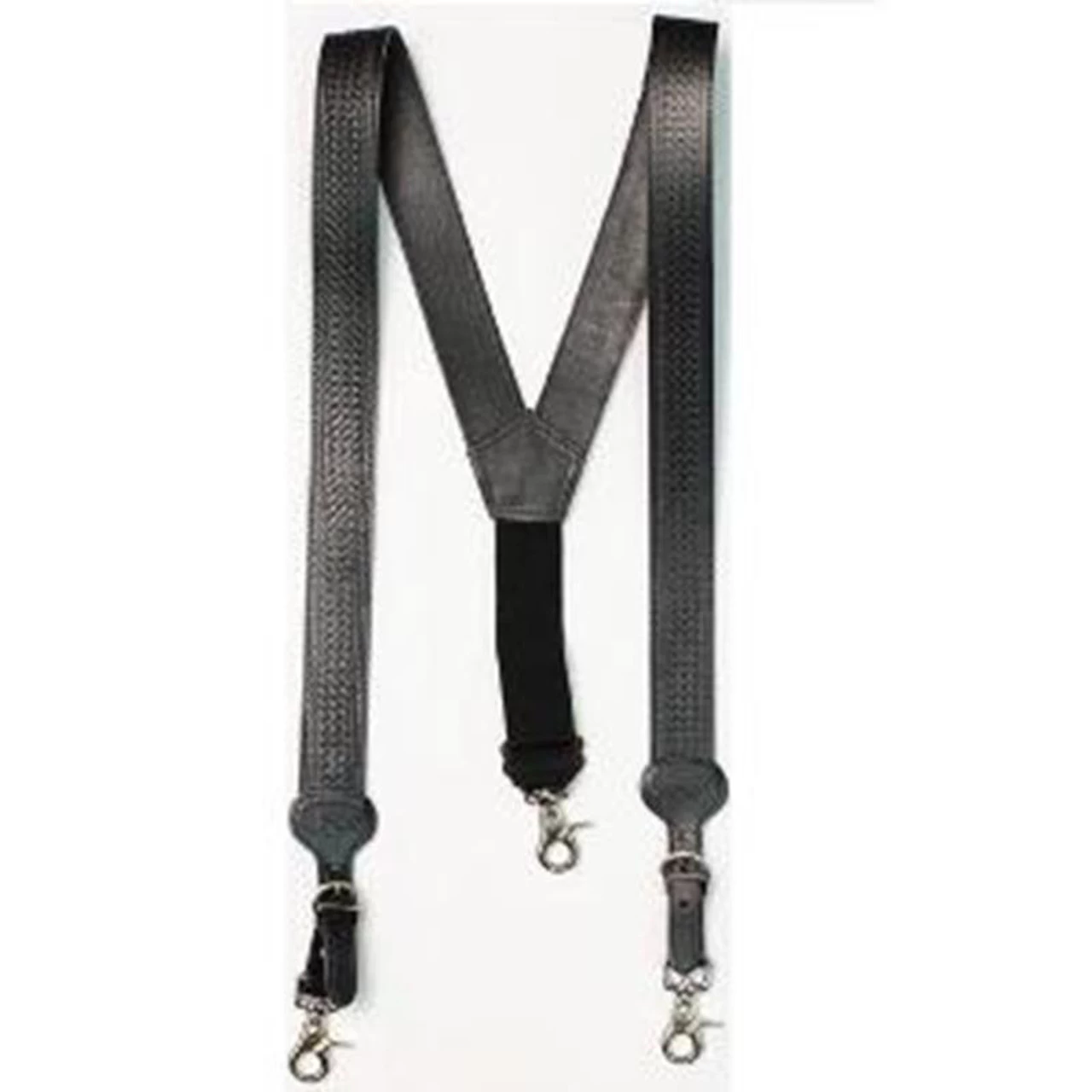 These leather galluses by M&F Western Products feature a tooled basket weave pattern. Heavy duty elastic adjustment on the back with one snap, and two trigger snaps in the front that attach to your belt loops to get that perfect fit.