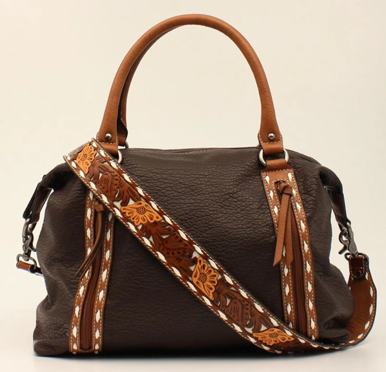 This conceal carry crossbody tote bag by M&F Western Products is from the Aaliyah collection and features a brown and tan floral embossed bottom with white buck laced edges. Adjustable crossbody strap to get a perfect length, plus carrying handles for versatility