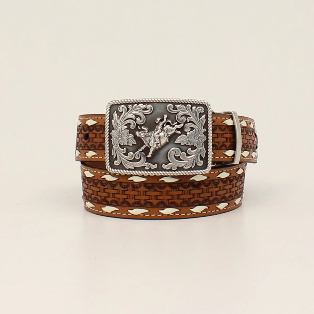 3D boys belt by M&F Western Products is genuine leather with a reversable strap. On one side of the belt strap is a basketweave embossing with ivory buck lacing. The other side is solid brown. Bull rider and floral scrolling on rectangular buckle that swivels for each side of the strap. Available sizes 20-30.