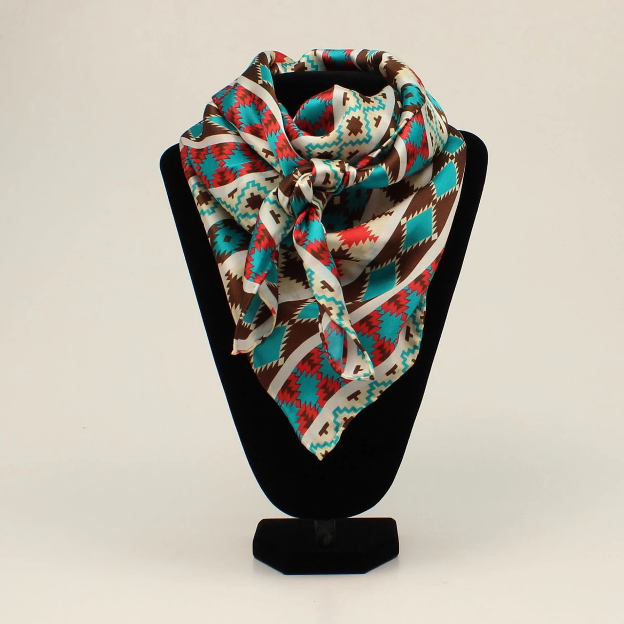 Beautiful wild rag from M&F Western Products. Pink, brown and turquoise Aztec pattern. Measures 33â x 33â.