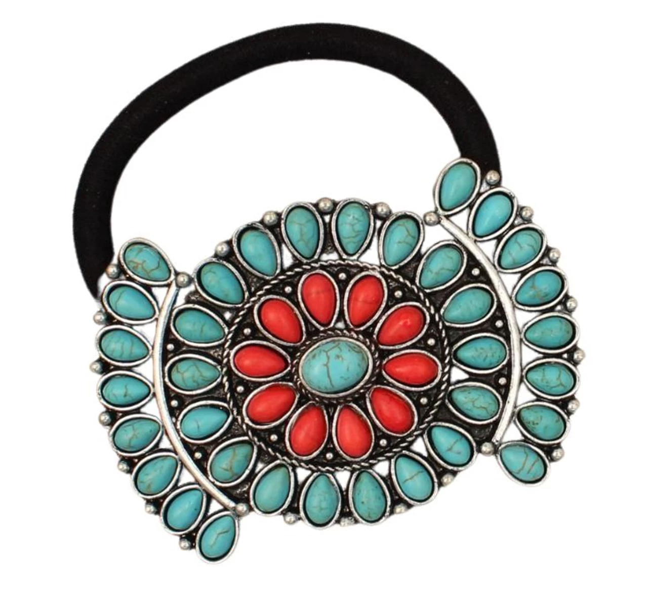 Stunning Blazin Roxx hair tie by M&F Western Products. It has a black elastic band with a sunburst concho and turquoise and red stones. Blazin Roxx Hair Tie Black Elastic Band Sunburst Concho Turquoise and Red Stones
