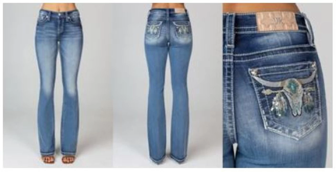 Mid-rise, medium wash regular bootcut denim. Back pocket features embroidered longhorn in desert design. Includes sequin and stud detailing. Embossed white leather patch with wing features Miss Me logo. Machine wash inside out in cold water. Hang dry. Front Rise: 9â ; Back Rise: 14â Inseam: 34″