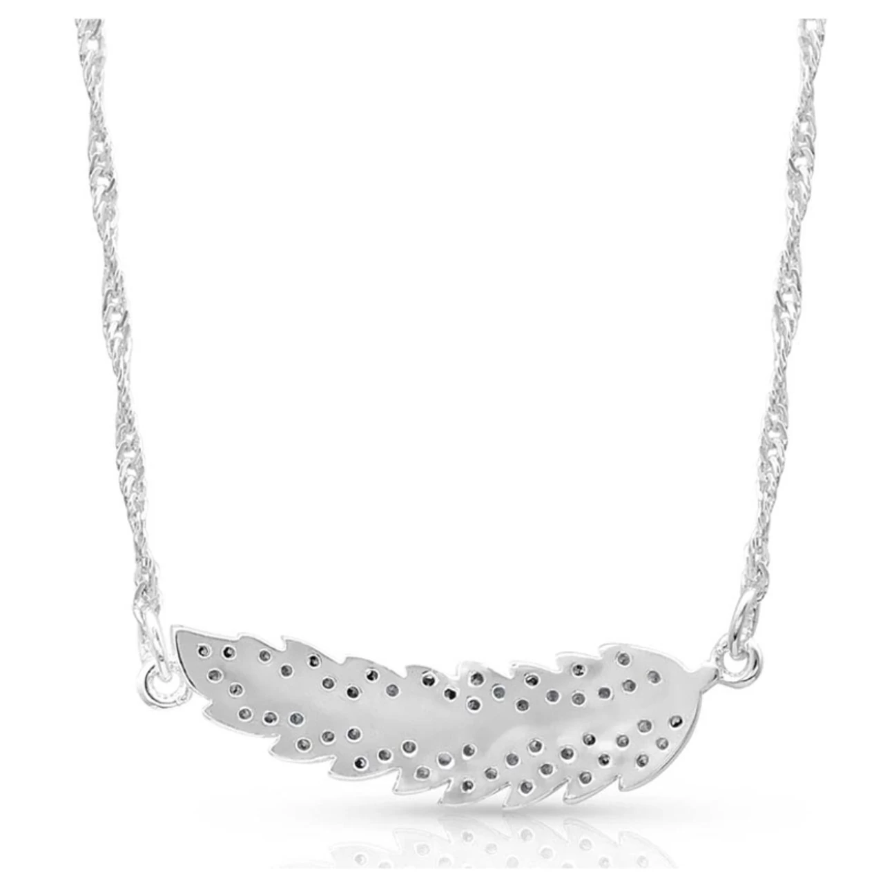 Add a little sparkle to your life with this clear stone encrusted feather necklace. A rippled edge silver toned feather has a just a hint of a curve to its design. The feather has a multitude of small stones set inside of the feather with a smooth silver toned edging and center vein. The feather rests horizontally along your neck on an 18 inch twisting split chain