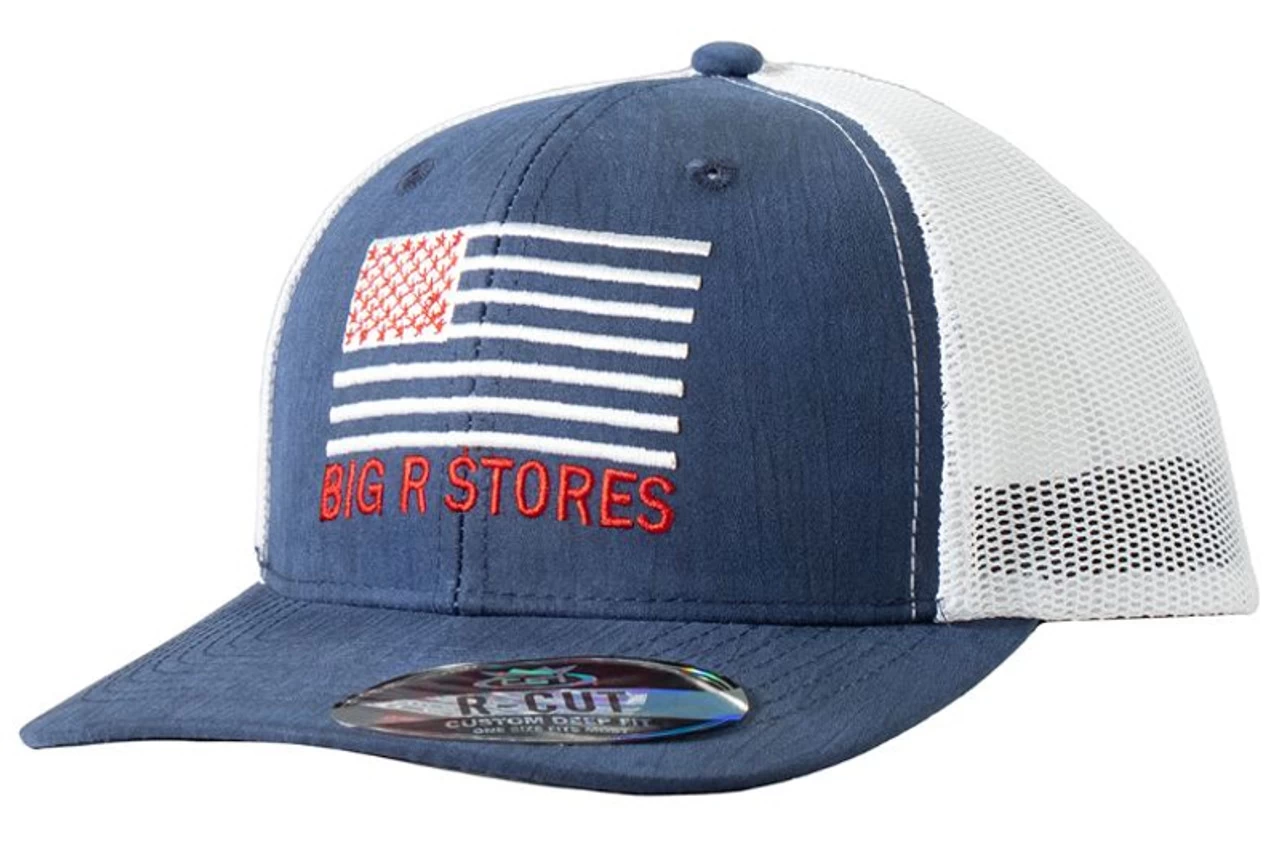 R Country Men’s Blue Big R Stores 6 Panel Trucker Cap American Flag Big R Logo on front Blue Front and Brim White Mesh Snap Back 6 Panel