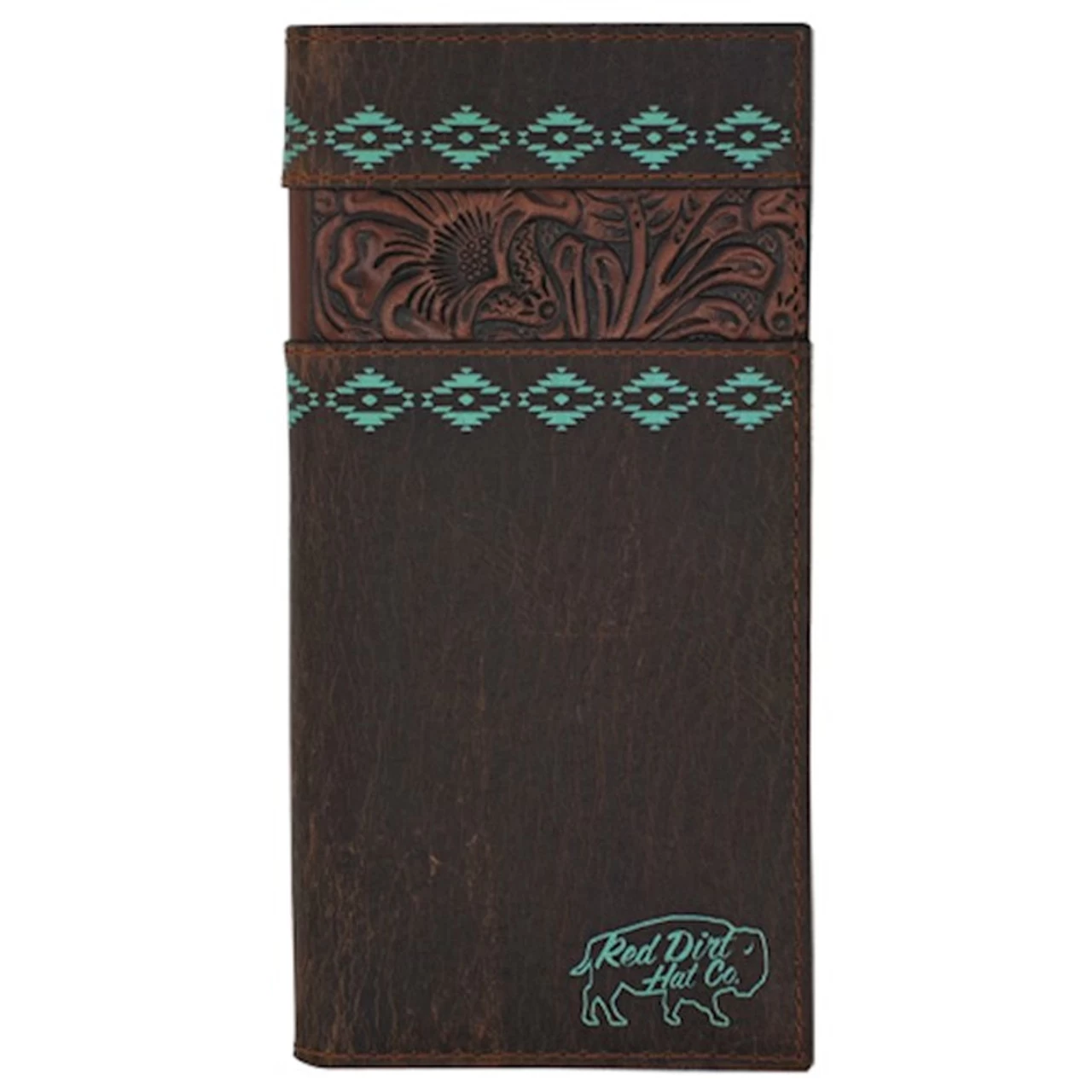 RED DIRT HAT CO. GENUINE LEATHER RODEO WALLET TOOLED ACCENT WITH TURQUOISE DESIGN 1 EXTERIOR SIDE SLIP POCKET 1 ACCESSIBLE ID SLOT 6 CREDIT CARD SLOTS 3 SLIP POCKETS