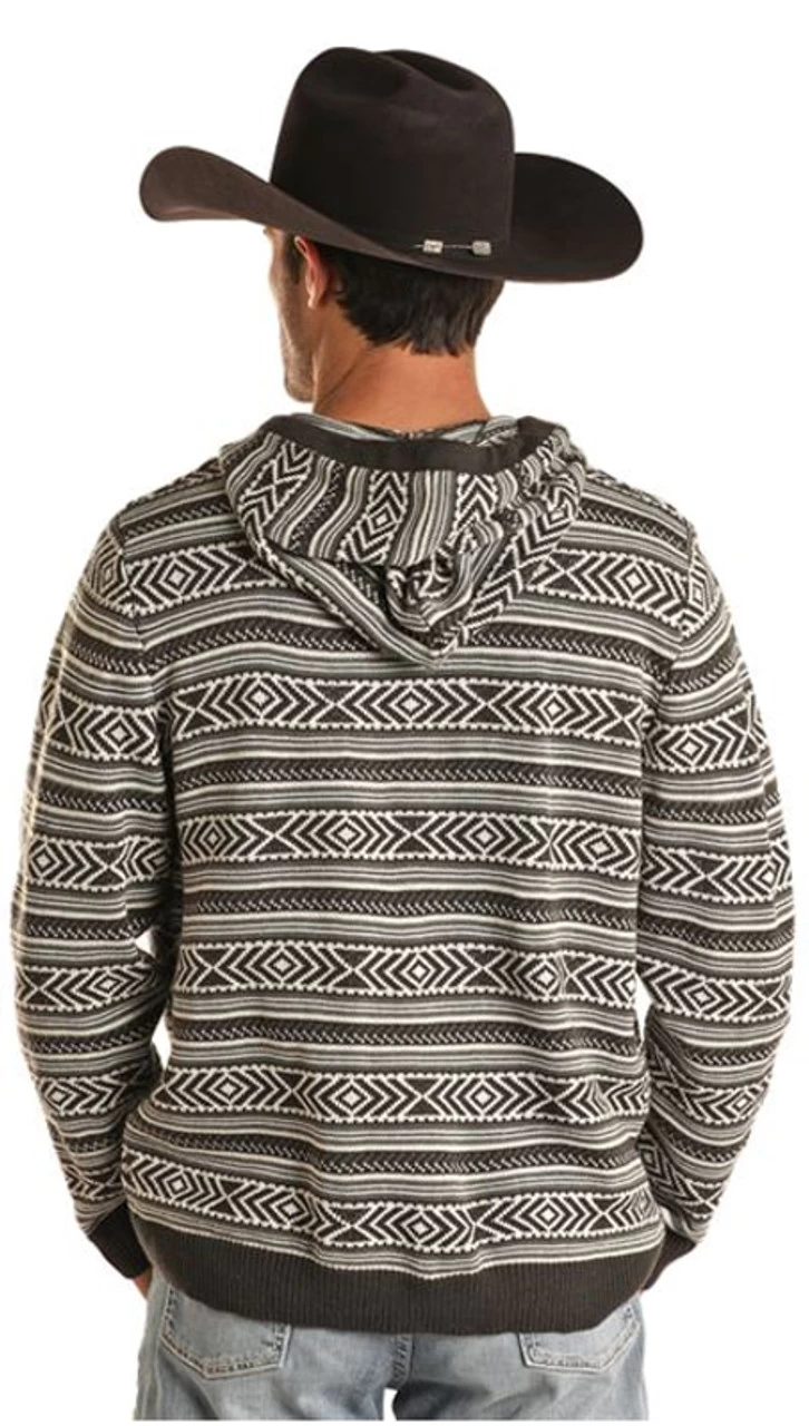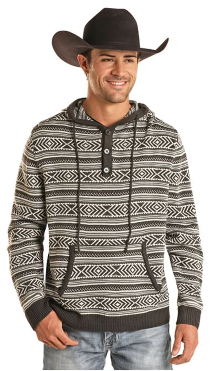 Rock and Roll Denim Men’s Charcoal Aztec Print Sweater Hoody Charcoal Aztec pattern Front kangaroo pocket Drawstring hoodie 1/4 button pullover Long sleeves Non-stretch