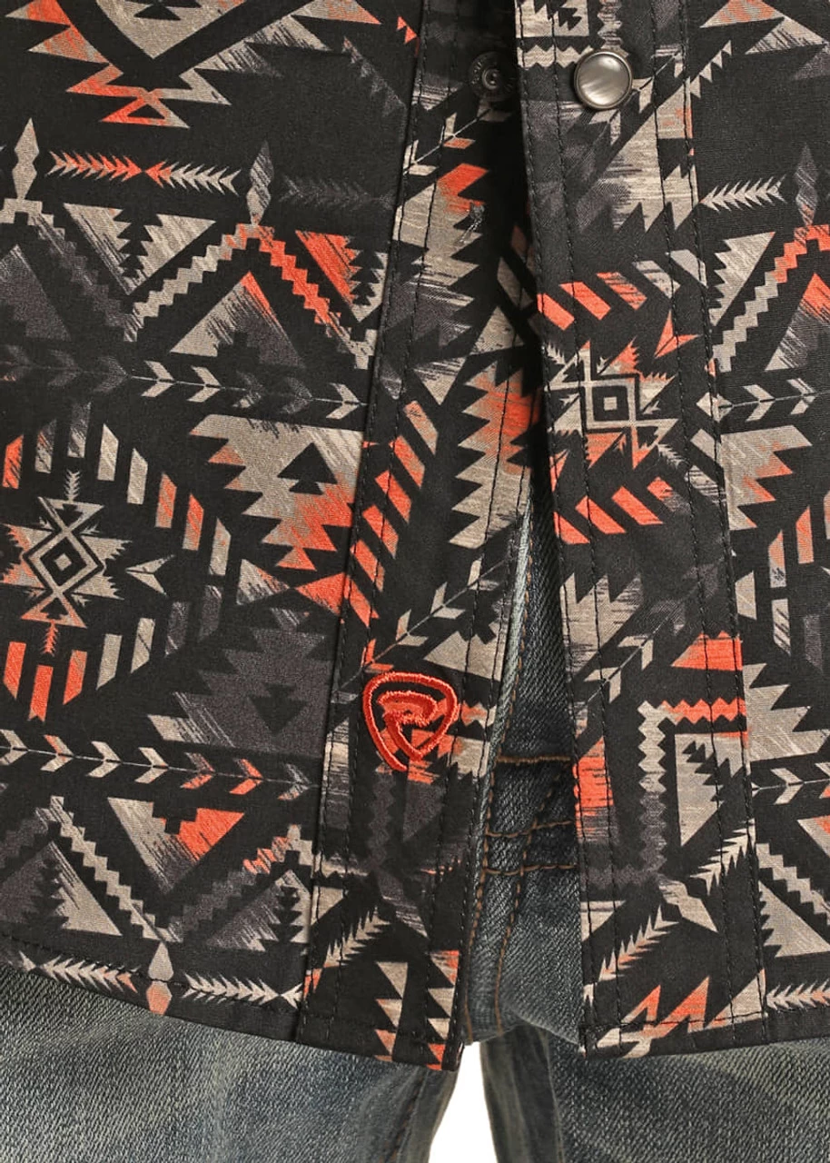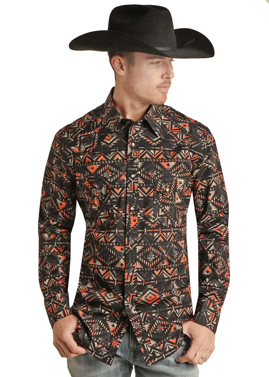 Rock and Roll Men’s Black/Peach Aztec Print Woven Snap Long Sleeve Shirt Black and Peach Aztec Print Button down collar and placket Western Yoke on back Two front snap chest pockets Slim Fit 97% Cotton 3% Spandex