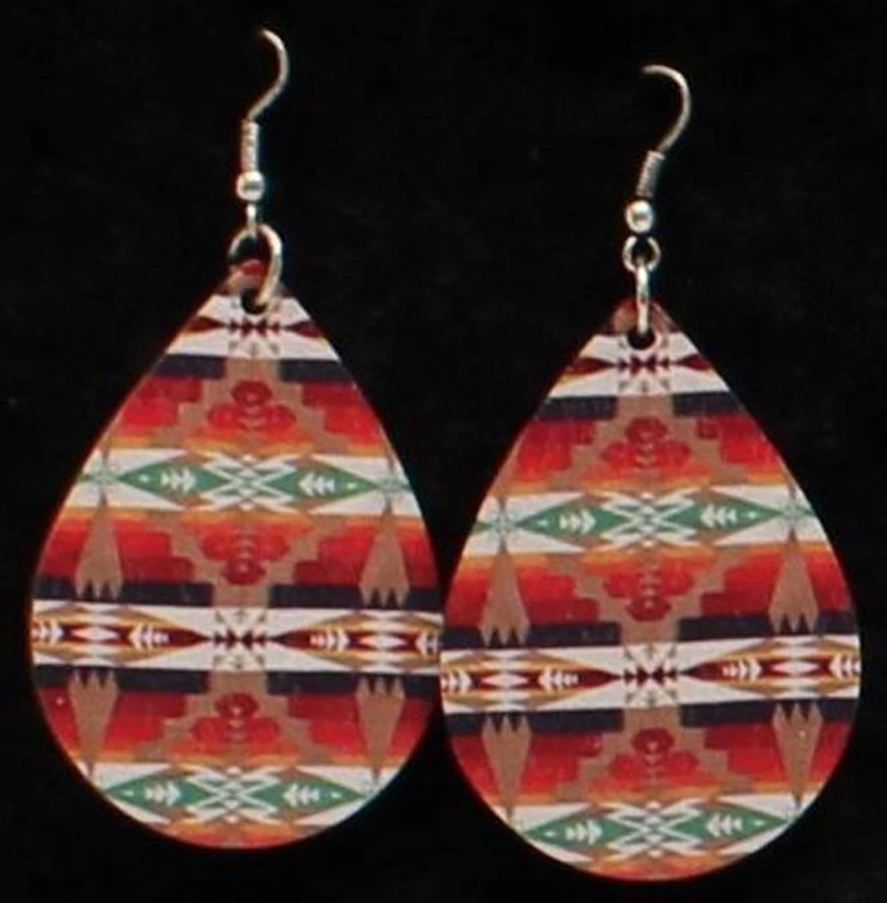 These Silver Strike earrings by M&F Western Products will be your favorite. They are a teardrop shape with a printed Aztec pattern. French hook style.