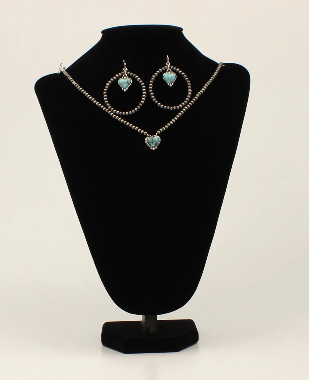 Lovely Silver Strike necklace set by M&F Western Products. Beaded necklace with turquoise heart pendant. Matching earrings.