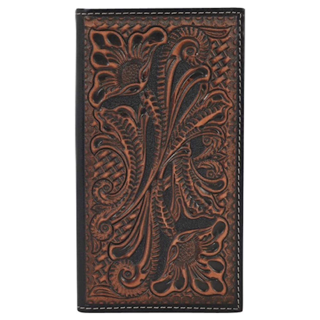 TONY LAMA RODEO WALLET, DARK BROWN W/CLASSIC TOOLED PATTERN, 5 CREDIT CARD SLOTS, 1 ACCESSIBLE ID WINDOW, 3 SLIP POCKETS, 1 CHECKBOOK HOLDER, 1 EXTERIOR SLIP POCKET