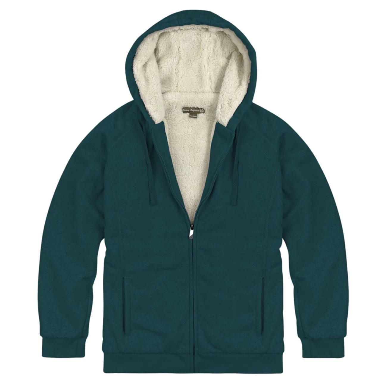 For those cold days when you still want casual comfort, grab this full-zip fleece hoodie lined with butter-soft sherpa. A winner for comfort and warmth. 2 Side Front Pockets Long Sleeve Drawstring Hoodie Attached Full Zipper Closure Sherpa Lining 100% Polyester