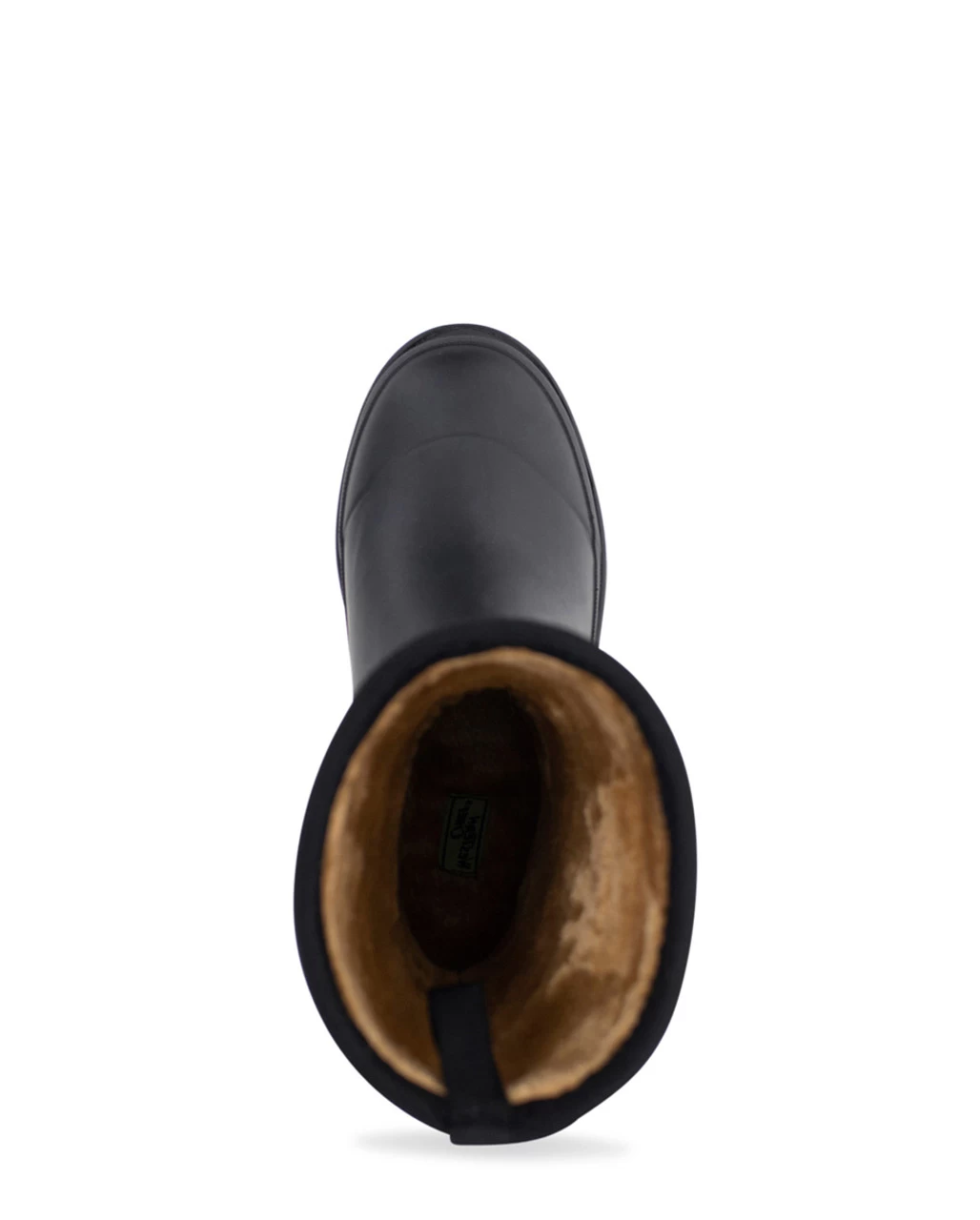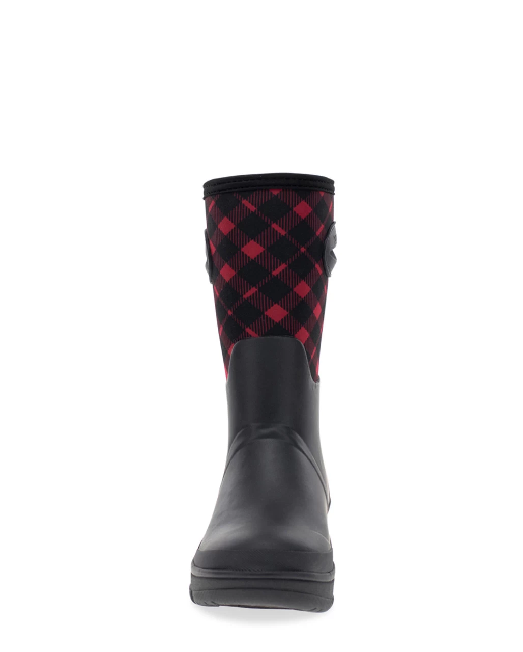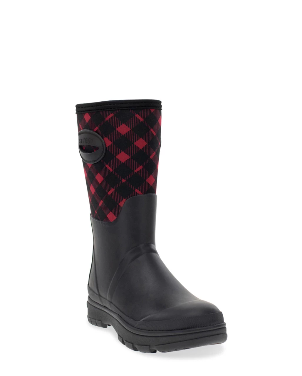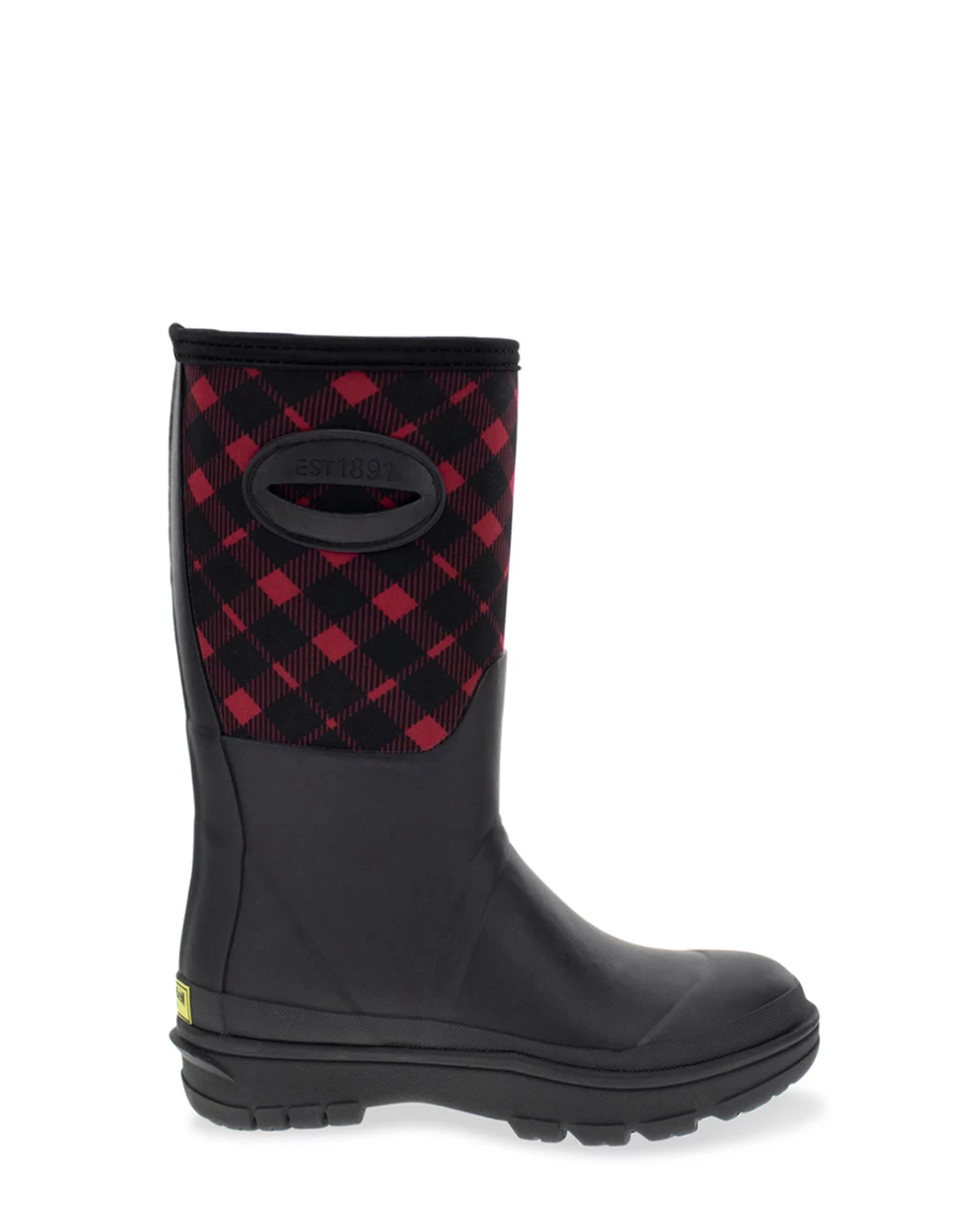Black waterproof winter boots. Red plaid neoprene print with breeze free handles. Insulated with neoprene lining and a comfortable memory foam insole. Cold-rated to hold-up in frigid temperatures. Boots are easy to clean after a day outdoors.>