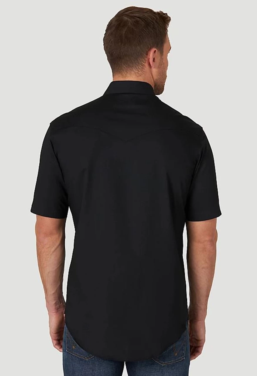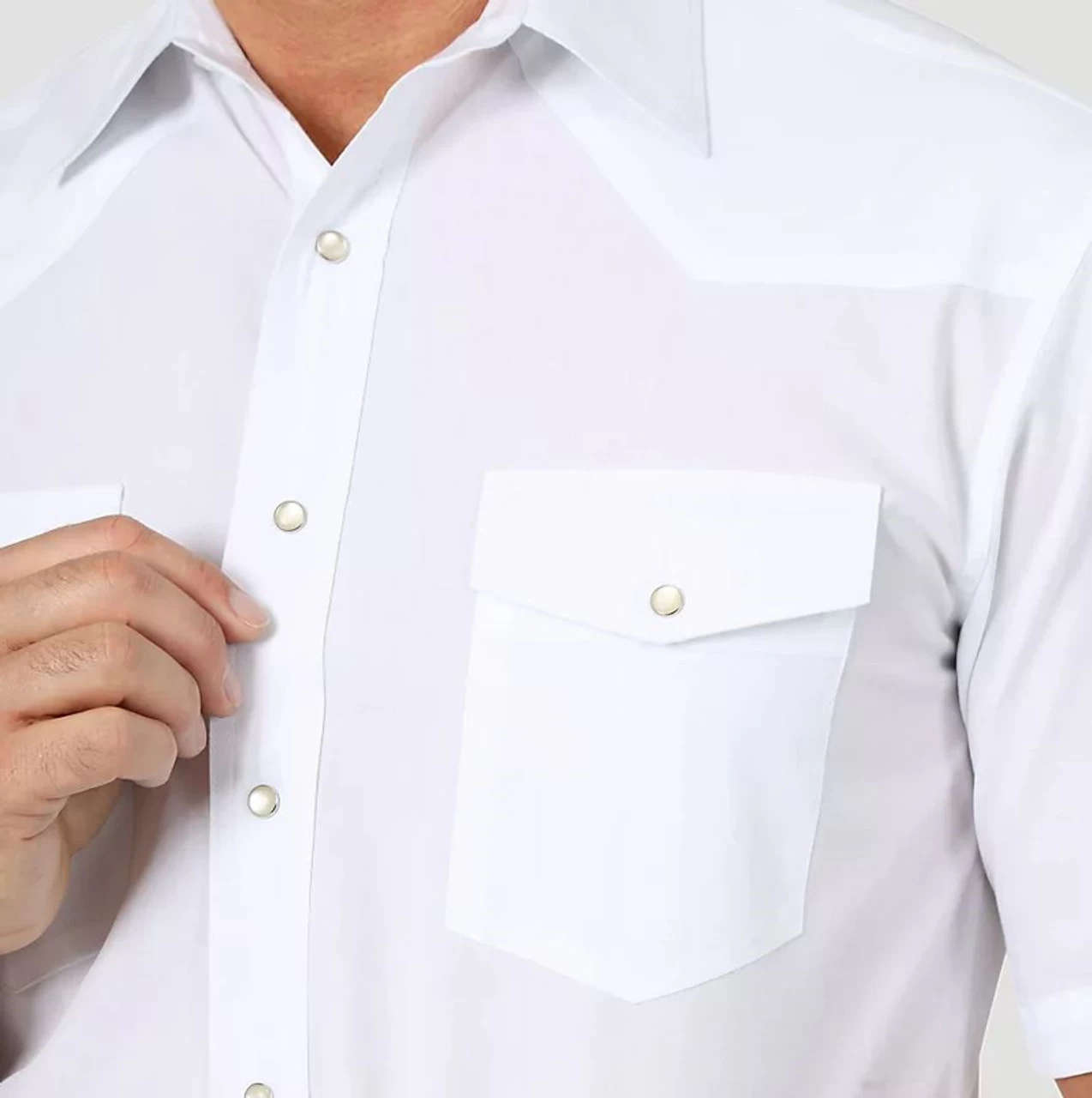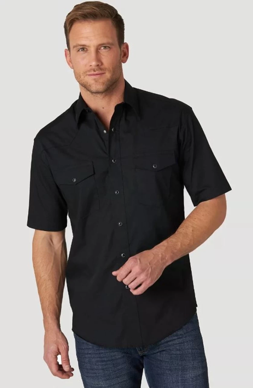 Made from a cotton blend, our sport Western snap shirt provides the ultimate level of comfort in an authentic Western style. The short sleeve shirt offers a casual, sporty look made for everyday occasions while our classic Wrangler styling gives it a Western edge thatâs true to your cowboy roots. A Wrangler Western shirt wouldnât be complete without our signature finishing touches, including a spread collar, authentic back yokes, and twin snap flap pockets with a pencil slot. Wear this familiar style with your go-to dark wash Wrangler jeans for a stylish, put-together look.