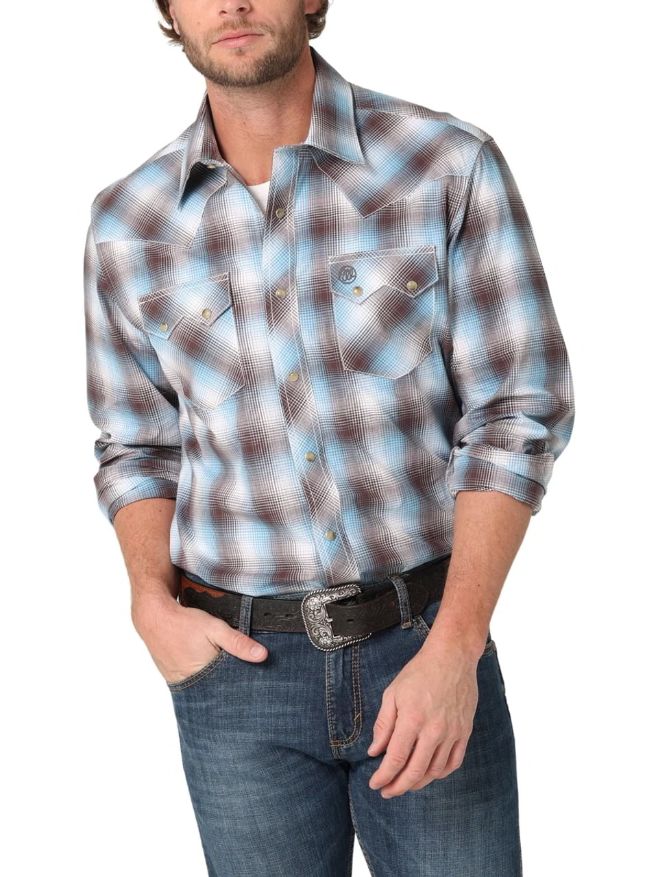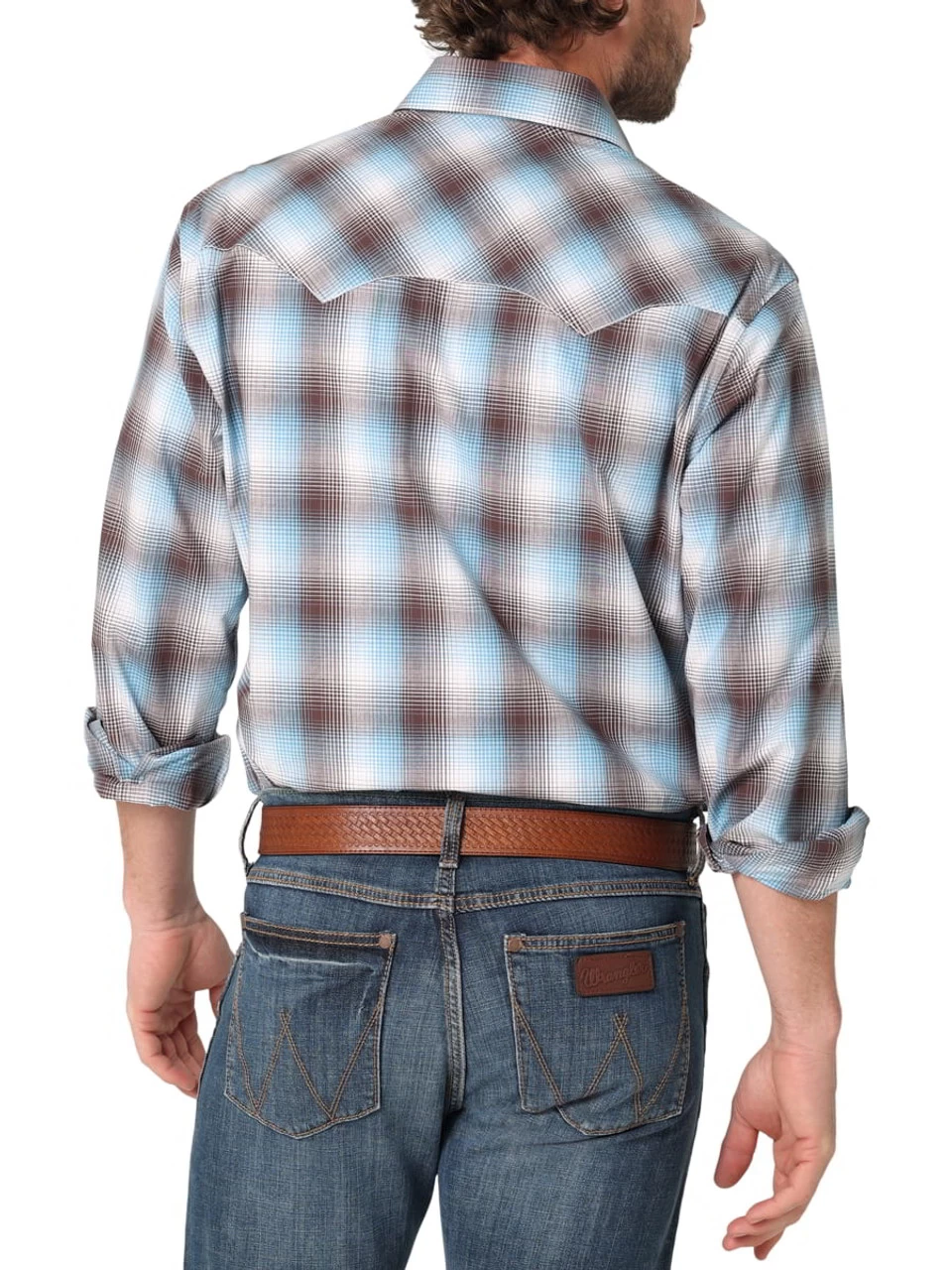 Wrangler Retro Mens Brown And Light Blue Plaid Modern Fit Long Sleeve Shirt
