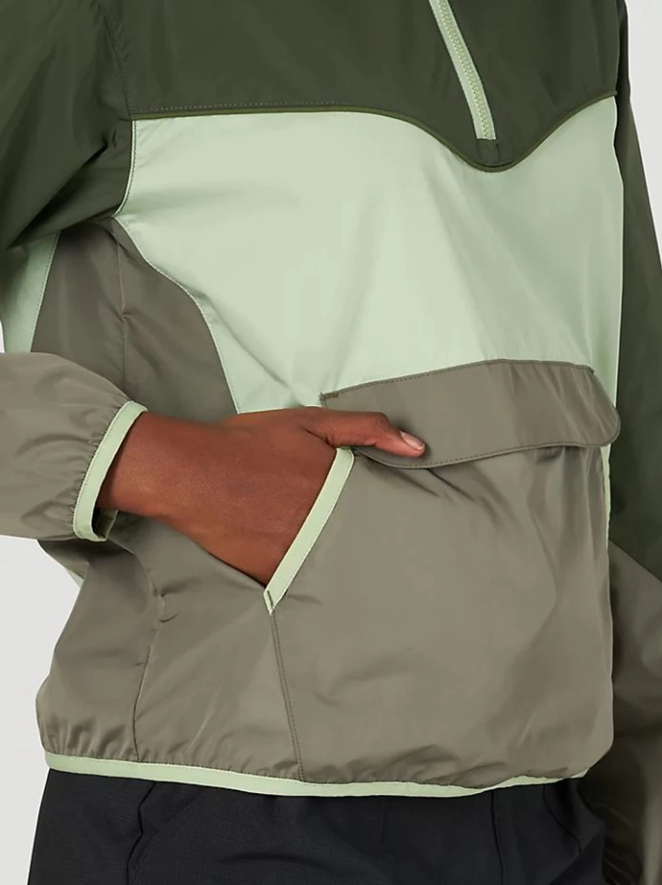 This sporty All Terrain Gear⢠by Wrangler style is built for superior comfort and performance in the great outdoors. The hooded ½-zip women’s windbreaker is both quick-drying and water-repellent to ensure that rainy conditions don’t put a damper on your nature walk, retreat, or backpacking adventure. Its UPF 50 keeps you protected from harmful UV rays, which can penetrate through clouds and rain. The lightweight, stretchy windbreaker is made from recycled materials and features a vented back yoke for extra comfort, oversized flap pocket with dual entry, and elasticized cuffs, hem, and hood for a closer fit on windy days. With a stylish, athletic look, the windbreaker is perfect for wearing through the rugged terrain of a new trail and the familiar terrain of your city.
